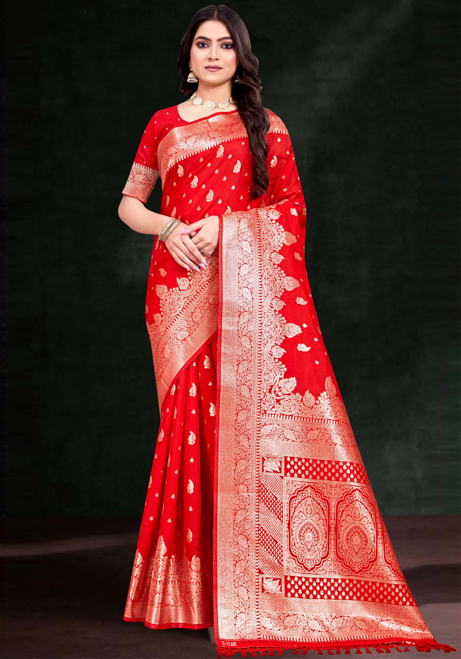 A stunning, vibrant red saree made of silk, likely a Banarasi style. The body of the saree has subtle, dotted patterns woven into the fabric. The highlight is the exceptionally ornate and wide border and pallu, which are intricately woven with silver or light gold metallic thread. The patterns on the border and pallu are rich and detailed, featuring traditional Indian motifs like paisleys, floral designs, and geometric shapes. The saree drapes elegantly and has a luxurious, rich texture, suitable for weddings, festive occasions, and formal events. The accompanying blouse piece appears to be a matching green with similar embellishments on the sleeves.