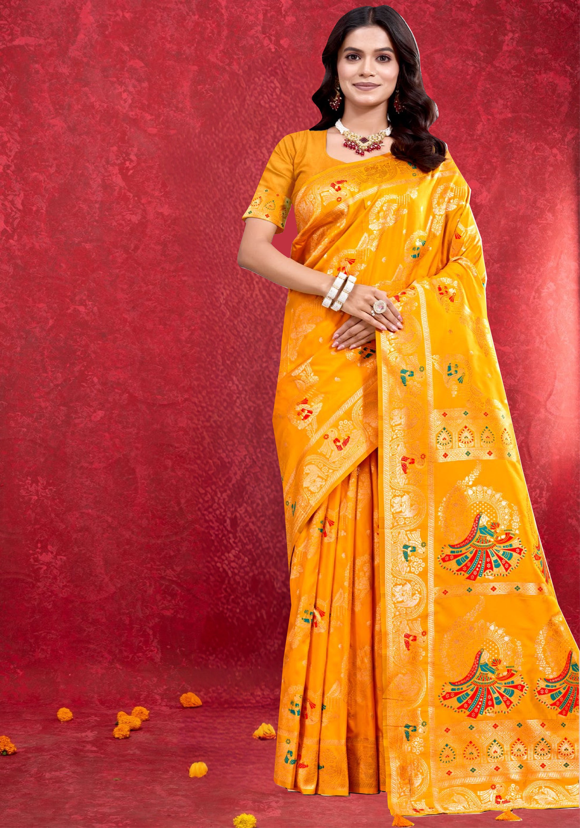 Colour: Bright Mustard Yellow with Multicolour Zari Weaving