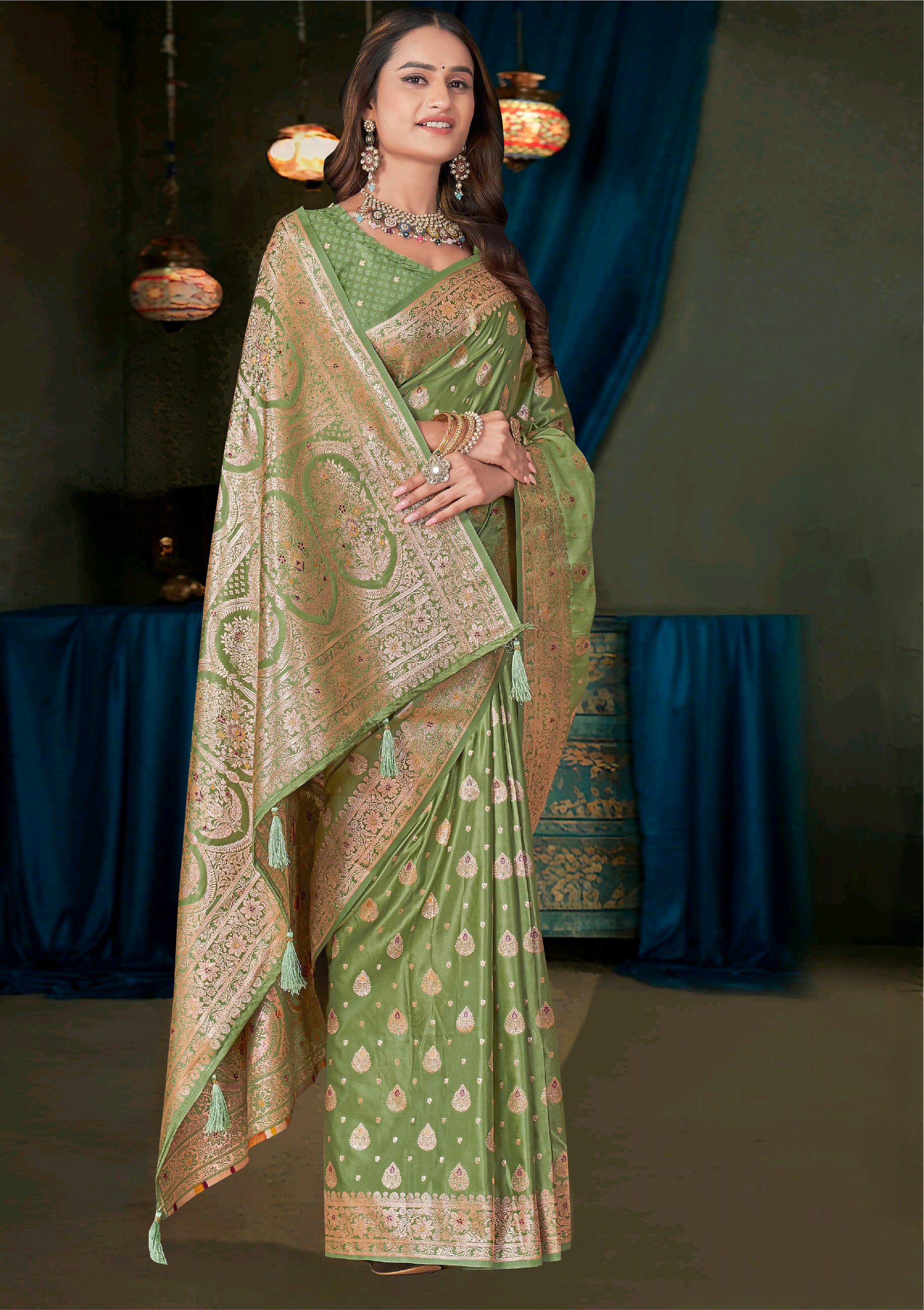 Drape yourself in sheer elegance with this Mehandi Green Banarasi Satin Saree, intricately woven with silver zari paisley motifs and traditional floral patterns. The body features delicate buti designs, while the grand pallu and border showcase heavy Banarasi weaving, adding a royal charm. The lustrous silk fabric enhances its richness, making it a timeless choice for weddings, festive occasions, and grand celebrations.