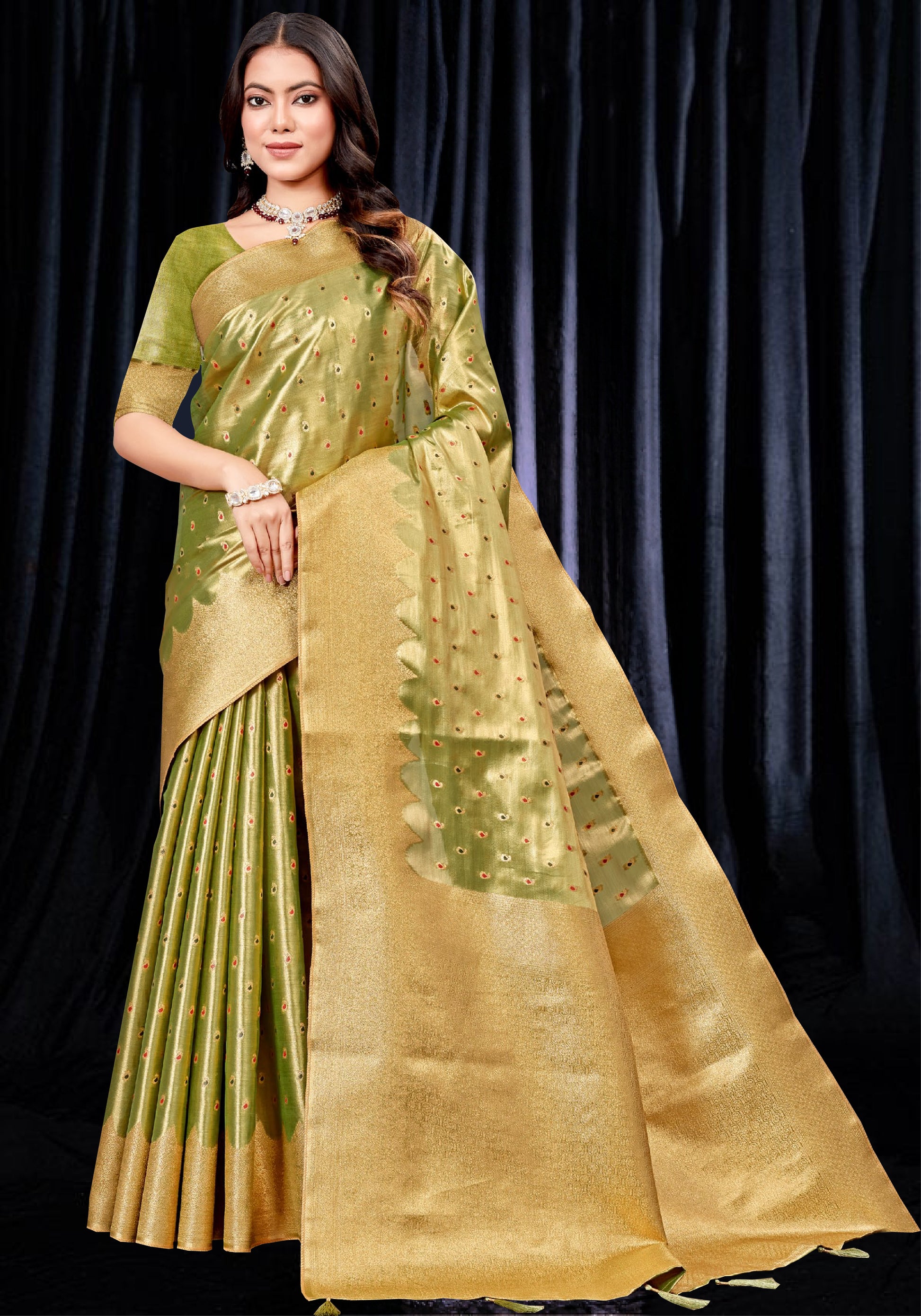 Exude sheer elegance with this Parrot Green pure tissue Silk Saree featuring a lustrous finish and delicate woven details. The saree is designed with subtle dotted motifs across the body and a plain yet rich golden pallu, radiating a regal charm. Its luxurious silk texture adds sophistication, making it a versatile choice for weddings, festive occasions, and grand celebrations. Pair it with heavy jewelry for a royal look or minimal accessories for timeless grace.