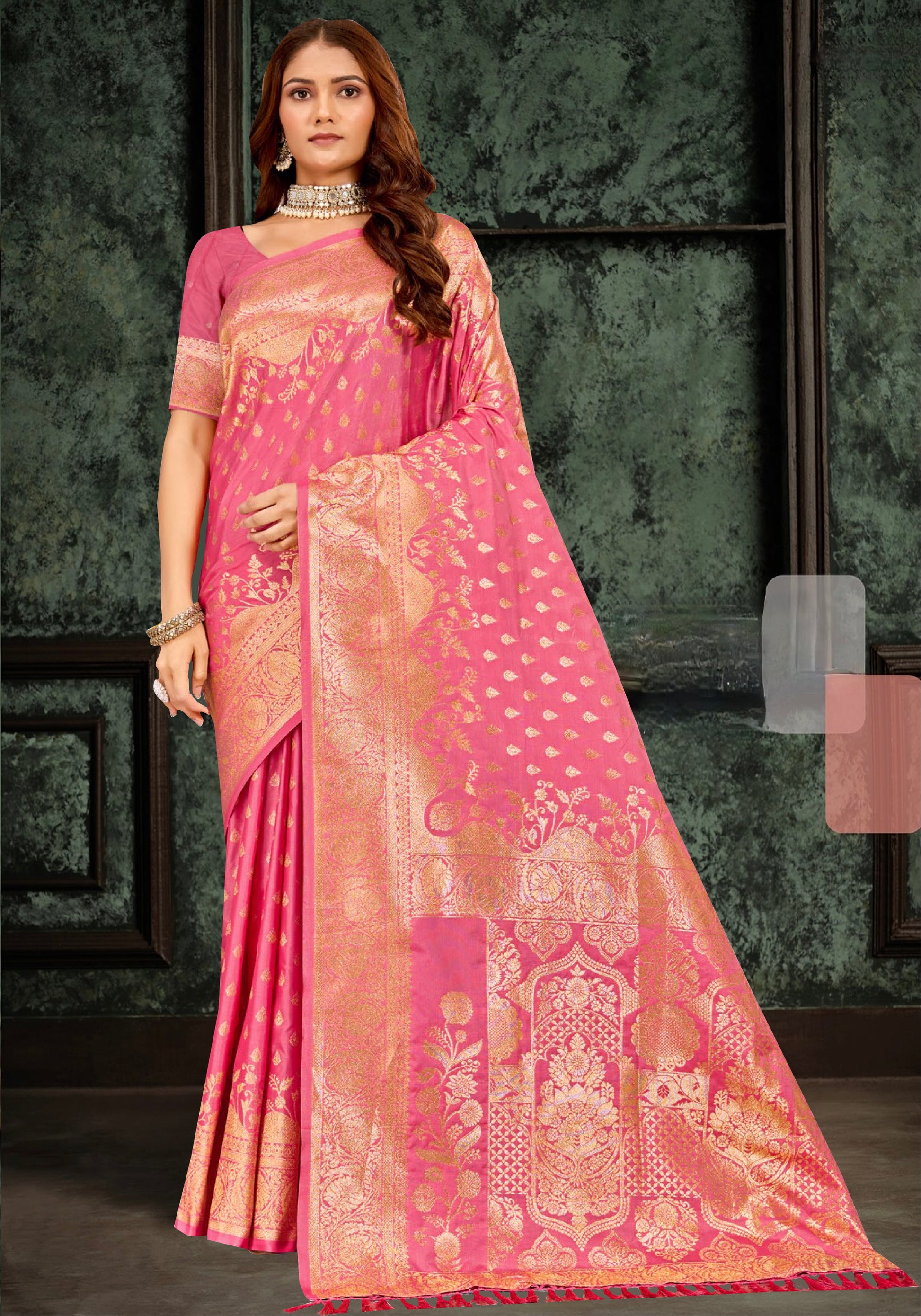 Grace your wardrobe with this Rani Pink Banarasi Silk Saree featuring exquisite zari weaving. The saree is adorned with golden floral and paisley motifs across the body, while the wide woven border and richly designed pallu showcase intricate craftsmanship. Its shimmering silk texture adds charm and sophistication, making it a perfect choice for weddings, festive occasions, and cultural celebrations. Pair it with statement jewelry to complete the regal look.