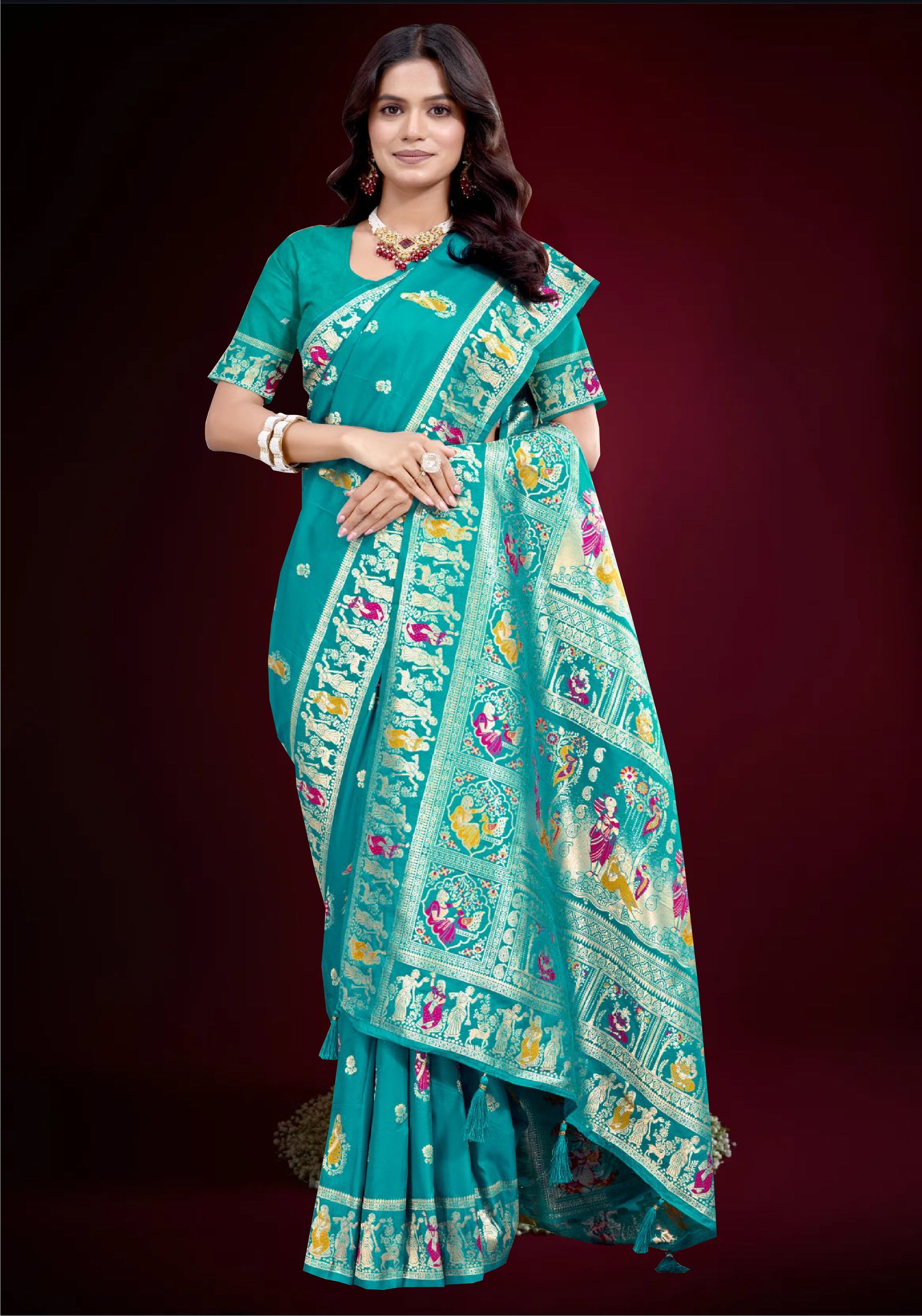 Adorn yourself in timeless elegance with this Sea Green Silk Saree featuring exquisite woven artistry. The saree is decorated with traditional motifs across the body, while the highlight is its grand pallu with intricate storytelling designs inspired by Indian heritage art. Detailed human and animal figures woven in resham and zari bring out the richness of craftsmanship. Perfect for weddings, festive celebrations, and cultural events, this saree blends regal charm with traditional aesthetics.